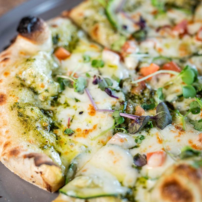 Pesto Sauce, Fontina Cheese, Zucchini, Hazelnuts, Olive Oil, and Edible Flower