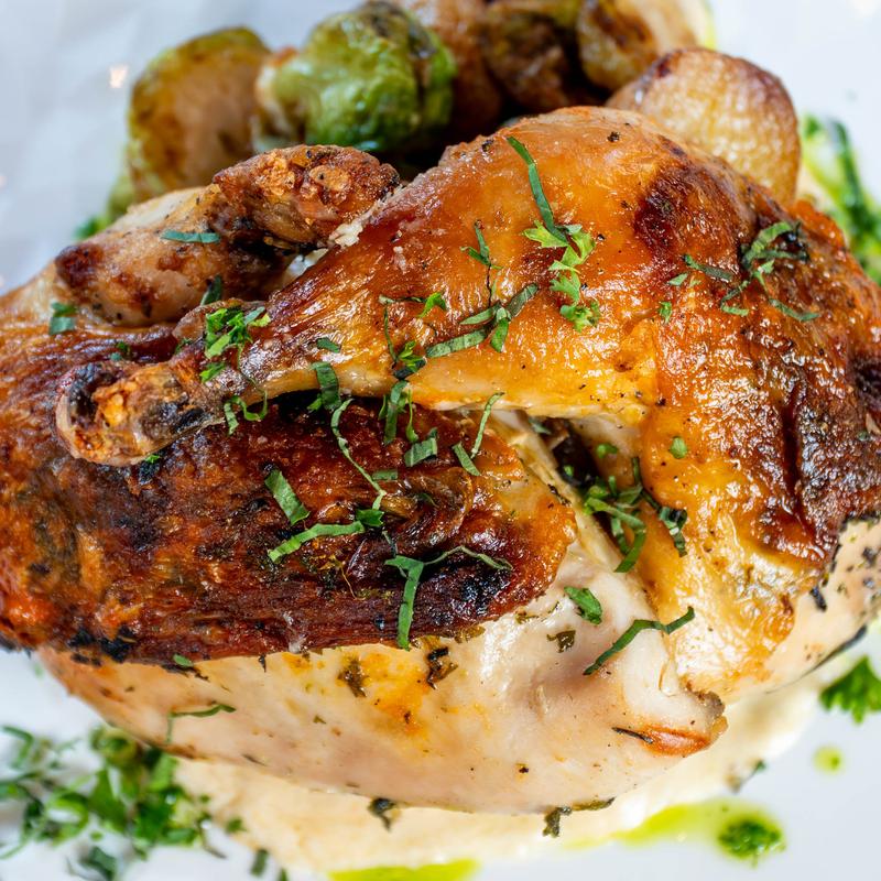 Lemon marinated chicken with oregano and potatoes, rapini, and pan sauce