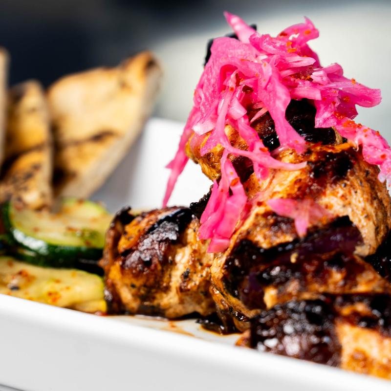 Brisa seasoned kabob served with whipped feta, za'atar naan, and sautéed zucchini.