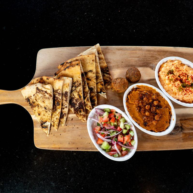 Wood-roasted chickpea hummus, whipped feta with harissa and oregano, quinoa tabbouleh served with za'atar naan and falafel.
