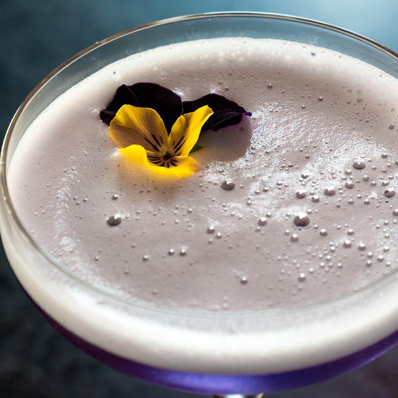 Empress Elderflower Rose Gin, Lemon Juice, Simple Syrup, and Egg White.